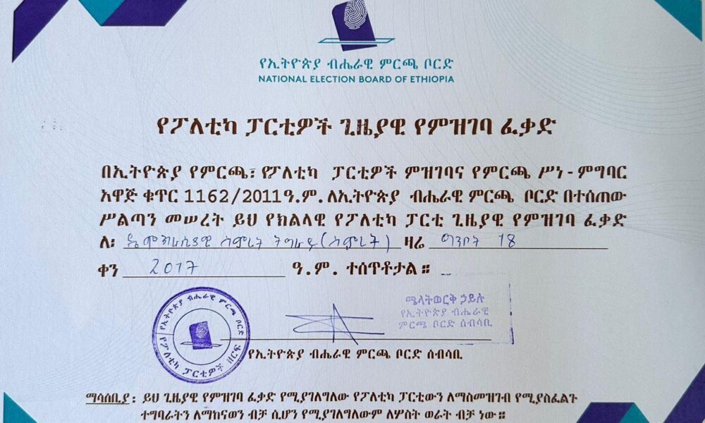 እቲ ዝተጣየሸ ውድብ “ዴሞክራሲያዊ ስምረት ትግራይ” (ስምረት) ተባሂሉ ዝፍለጥ ክልላዊ ውድብ እንትኸውን ካብ መረፃ ቦርድ ኢትዮጵያ ድማ ሎሚ 18 ግንቦት 2017 ዓ.ም ግዚያዊ ናይ ምዝገባ ኣፍልጦ...